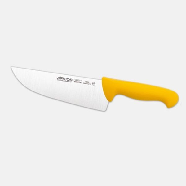 La herramienta culinaria idónea para el despiece de alimentos es el cuchillo carnicero serie 2900 mango amarillo. Cuenta con las siguientes especificaciones: La pieza diseñada para el corte de alimentos cuenta con una hoja suficientemente ancha faricada en NITRUM®, un material de alto rendimiento. La herramienta Arcos cuenta con excelentes propiedades de dureza, resistencia y corte. El filo que posee el cuchillo carnicero serie 2900 es liso, resistente y estable. El mango es ergonómico, por lo que resulta muy cómodo. Es resiste a golpes, a altas temperaturas y antideslizante, por lo que rinda al usuario un excelente agarre.