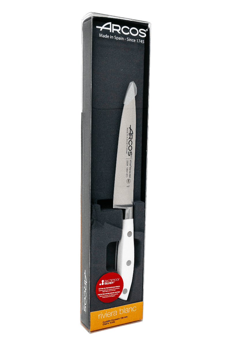 Con el cuchillo cocinero de la serie Riviera dispones de una de las mejores gamas de cuchillos fabricados en España. Esto se debe a que está fabricado con una hoja de acero inoxidable Nitrum®, un material patentado por Arcos y único en todo el mundo. Proporciona un afilado preciso y durable para rebanar o cortar carne, pescado, cebolla y otros ingredientes. Se trata de un cuchillo forjado en una pieza que garantiza el nivel de excelencia al momento de ajustarse al mango con remaches de acero inoxidable. También incorpora un sistema anti-bacteriano para mayor seguridad e higiene durante las tareas de cocina. Incluye un estuche que puede usarse para guardar el cuchillo de forma segura. Requiere de cuidados sencillos para prolongar su vida útil. Resistente a la corrosión y al deterioro por usos intensivos. Cuenta con una virola francesa que le proporciona una estética elegante. Es apto para el lavavajillas, aunque se recomienda limpiar a mano.