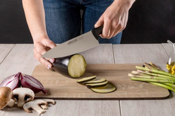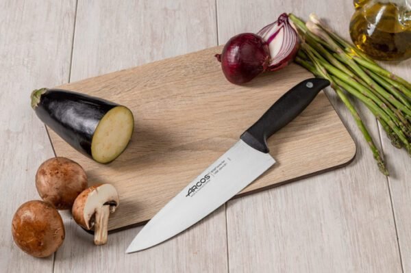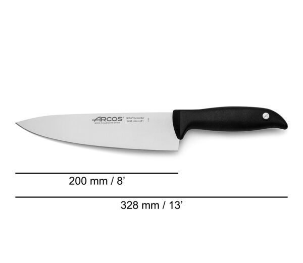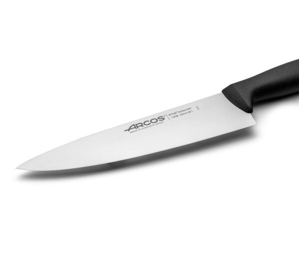 El cuchillo de cocinero de la serie Menorca cuenta con un diseño innovador para los cocineros más destacados. Está fabricado en Albacete, España, por manos expertas en cuchillería. Hoja larga de 200 mm de acero inoxidable NITRUM®, un material exclusivo de Arcos para mayor durabilidad y poder de corte. Tiene un mango de Polipropileno (PP) que garantiza un agarre cómodo y ergonómico. Es resistente a las altas temperaturas y la corrosión. Se fabrica en un diseño único de mango-hoja. Apto para el lavavajillas, aunque se recomienda limpiar a mano para alargar la vida útil del filo.