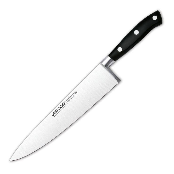 Una de las principales características de este cuchillo cebollero o cocinero es su hoja de 200 mm, que lo convierte en una herramienta adecuada para los cocineros más exigentes o las cocinas más demandantes. Además, cuenta con un diseño elegante gracias a la virola de estilo francés, propia de la serie Riviera. Incluye un estuche para que puedas guardar el cuchillo tras su uso y mantenerlo protegido de agentes externos. Hoja fabricada en acero inoxidable NITRUM®, un material patentado por Arcos que garantiza un buen corte. Mango de color negro, unido a la hoja mediante una estructura forjada de una sola pieza con remaches de acero. Se trata de una pieza resistente a los golpes y las altas temperaturas. Incluye un sistema antibacteriano que mejora la higiene del cuchillo. Al estar forjado en una sola pieza, evita la acumulacióon de suciedad. Estructura resistente a la corrosión. Es apto para lavavajillas, aunque se recomienda lavar a mano para alargar la vida útil del cuchillo