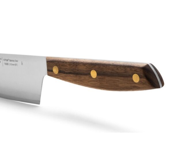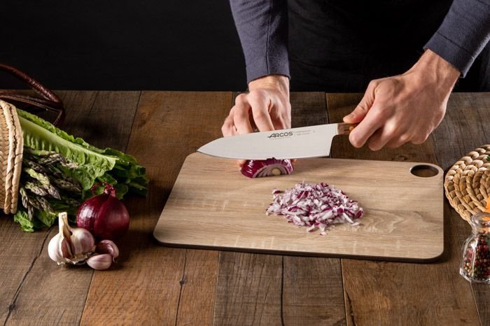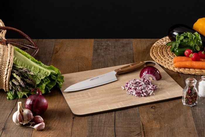 Con el Cuchillo Cocinero Serie Nórdika de Arcos te convertirás en un maestro de las verduras y hortalizas. Disfruta con este accesorio culinario con filo especial seda que aúna tradición y tecnología avanzada. Su corte es suave, preciso y exquisito, al nivel de los mejores chefs. El cálido tacto de su mango de madera Ovengkol 100 % natural, procedente de bosques certificados FSC® con código de licencia FSC® - C160381 bien gestionados, proporciona una sensación única de autenticidad y soltura. Además, sus remaches de latón actualizan el diseño con un original toque de vanguardia. Preparar la comida, con él a mano, se convierte en una experiencia deliciosa. Fíjate en estas ventajas. Materiales de élite: El acero inoxidable NITRUM® al nitrógeno de Arcos proporciona un corte rápido y potente, así como una prolongada durabilidad, complementada con nuestro servicio de afilado.