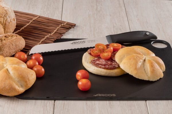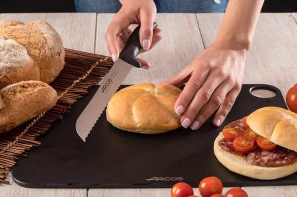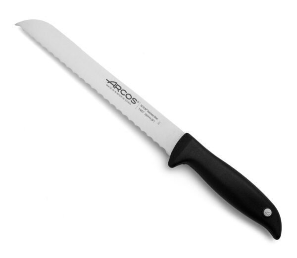 El Cuchillo panero Serie Menorca 200 mm Es consistente, pero liviano, para facilitar su manejo en cualquier cocina. Proporciona cortes perfectos en baguette, panes para sándwich, pan redondo, e incluso bizcochos. Cuenta con una hoja de sierra fabricada en acero inoxidable NITRUM®, que le otorga mayor dureza y durabilidad. No necesita afilado. Fabricado a través de procesos de inyección para lograr un bloque único hoja-mango, lo que le aporta una firmeza total a la pieza. Su mango es antideslizable y seguro. Está elaborado con polipropileno (PP) resistente a las altas temperaturas y los productos químicos. Diseñado en Albacete, España, por manos expertas en cuchillería desde el año 1734. Puede introducirse en el lavavajillas.
