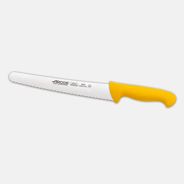 El cuchillo pastelero serie 2900 tiene un filo en forma de sierra para evitar que se estropee al momento de cortar una rebanada de pastel o bizcocho. No necesita afilado y puede conservarse en perfectas condiciones siguiendo nuestros consejos de uso. Hoja de acero inoxidable NITRUM®, una ténica exclusiva de Arcos que proporciona dureza y poder de corte. Mango de polipropileno inyectado que proporciona un agarre cómodo, sin deslizamientos. El color del mango permite diferenciar los alimentos con los que debe utilizarse. Impide la contaminación cruzada. Es apto para el lavavajillas.