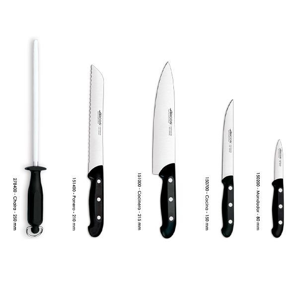 Este juego de cocina 4 piezas serie Maitre + chaira + taco Arcos tiene todos los cuchillos que necesitas para la preparación de diversos tipos de alimentos. Se trata de un set formado por un cuchillo mondador de 80 mm, cuchillo de cocina de 150 mm, cuchillo de chef de 215 mm, cuchillo panero de 210 mm y chaira de acero al carbono de 250 mm. Cuchillos con hojas forjadas en acero NITRUM®, material resistente a la anticorrosión y duradero. Mango de polipropileno de alta resistencia al calor y químicos. Pueden introducirse en el lavavajillas.